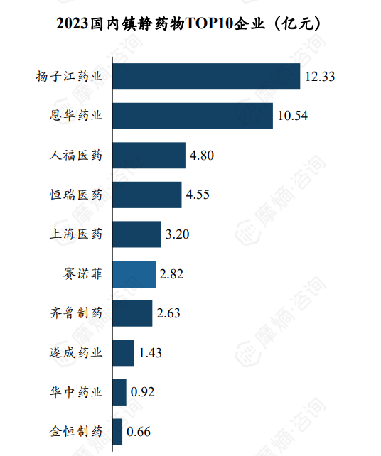 扬子江药业和恩华药业是镇静药物的头部企业。2023年镇静药物销售额达到了12.33亿元与10.54亿元,远超其他企业。