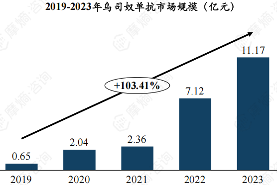 乌司奴单抗最早是2017年底在中国获批,用于治疗斑块型银屑病,2020年又获批用于克罗恩病。上市前期由于高昂的治疗费用未能实现放量。2021年被纳入国家医保目录,销售额实现大幅提升,由2021年2.36亿元提升至2022年7.12亿元,2023年进一步提升至11.17亿元。