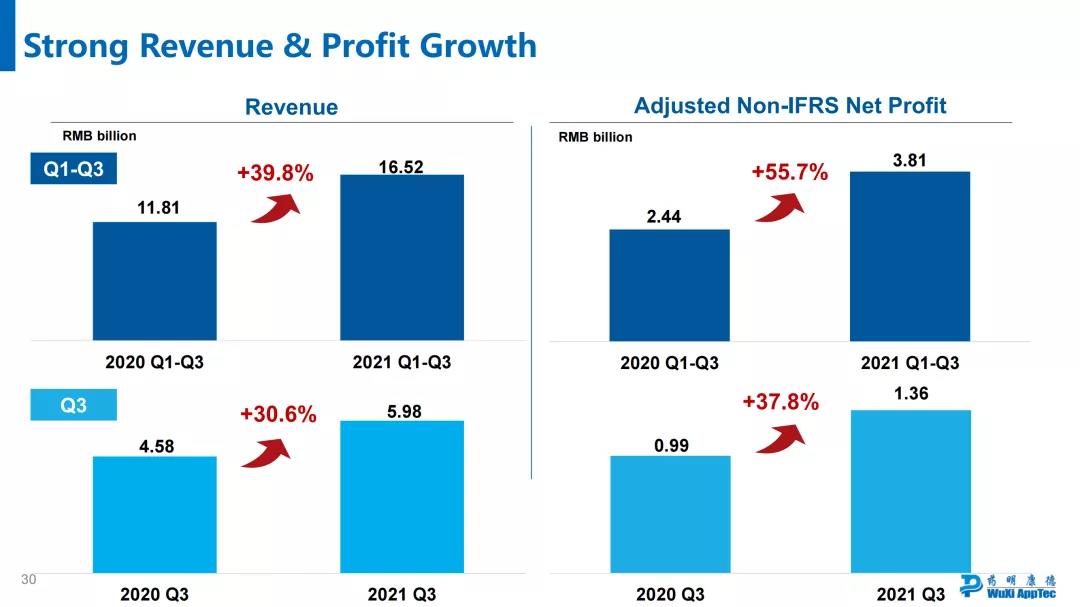 1、无锡药明康德新药开发股份有限公司(以下简称“本公司”)预计 2021年年度营业收入与 2020 年年度(以下简称“上年同期”)的人民币 1,653,543.15万元相比,增加人民币 628,346.40 万元到人民币 636,614.11 万元,至人民币 2,281,889.55 万元到人民币 2,290,157.26 万元,同比增长 38.0%到 38.5%。
