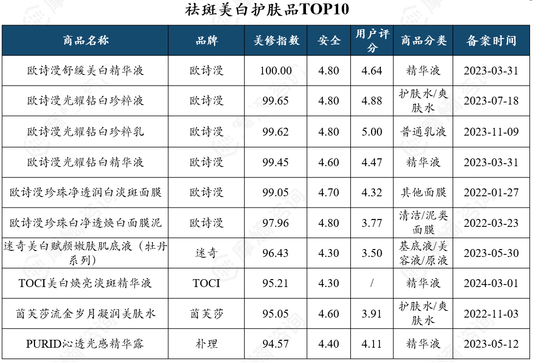 欧诗漫位列祛斑美白品牌TOP1,共有50款祛斑美白功效的产品。祛斑美白化妆品被归类为特殊化妆品,监管严格,上市流程远比普通化妆品复杂,涉及多项技术指导原则和严格的功效验证,成本较高且周期较长,故门槛更高。因此,虽祛斑美白产品市场潜力巨大,但产品备案数量较少,祛斑美白功效产品在各大品牌的占比均较低。
