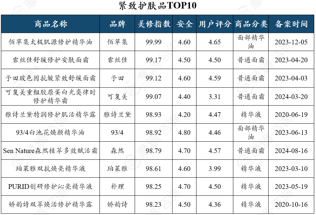紧致护肤品产品形态主要为精华和面霜,佰草集太极肌源修护精华油仍位居紧致护肤品第一名,兼具修护、保湿、抗皱、紧致、舒缓功效,且温和无刺激,适用于敏感皮肤,雅诗兰黛、娇韵诗等进口高端品牌产品也排名靠前。