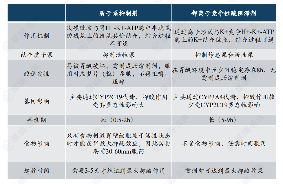 相比质子泵抑制剂只能与活跃状态的H+-K+-ATP酶结合,钾离子竞争性酸阻滞剂与处于静息或活跃状态的H+-K+-ATP酶均能结合,且钾离子竞争性酸阻滞剂无需酸激活可直接与H+-K+-ATP酶结合,因此钾离子竞争性酸阻滞剂抑酸作用更加迅速。