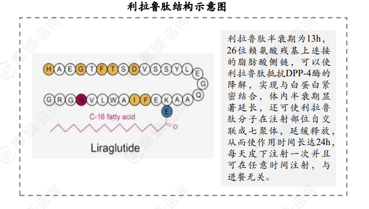 利拉鲁肽在天然GLP-1基础上进行了两个氨基酸位点的修饰,其一是天然GLP-1第34位赖氨酸残基被精氨酸取代,其二是第26位赖氨酸残基增加一个由谷氨酸介导的16碳棕榈酰脂肪酸侧链,在保留天然GLP-1所有生物活性的同时,延长了与白蛋白结合的时间,体内半衰期显著延长,可实现每日给药一次。