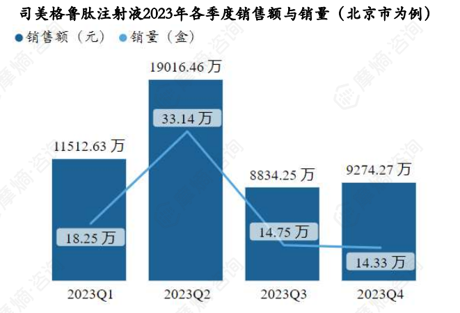 据摩熵医药药物流向数据显示,以北京市为例,司美格鲁肽注射液2023年各季度销售量和销售额如下图: