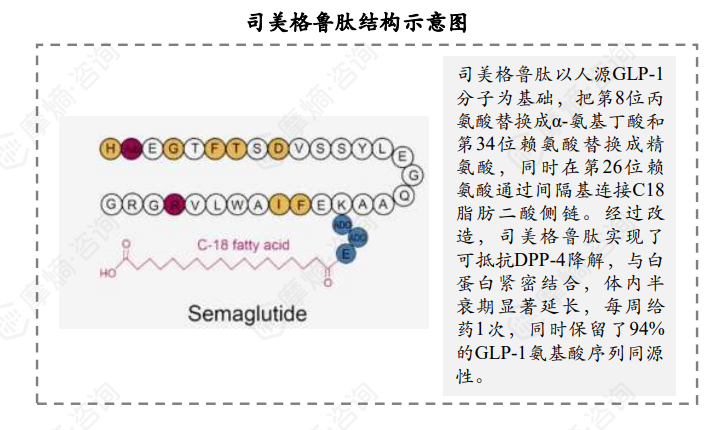 司美格鲁肽由31个氨基酸组成,结构与天然GLP-1相似,具有高达94%的氨基酸序列同源性,第26位赖氨酸上连接有一个C18脂肪二酸侧链,这种修饰可增加司美格鲁肽与血液白蛋白的结合,从而延长其在血液循环中的存在时间,可实现每周给药一次。