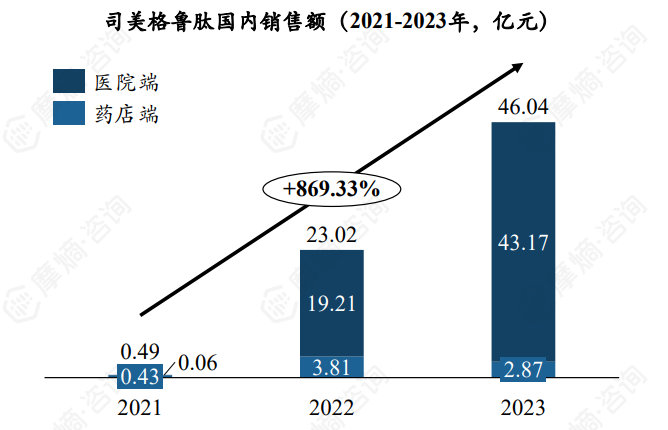国内市场方面,根据摩熵医药销售数据库,2023年司美格鲁肽全国销售额达46亿元,2021-2023年复合增速高达869%,预计未来仍将快速增长。