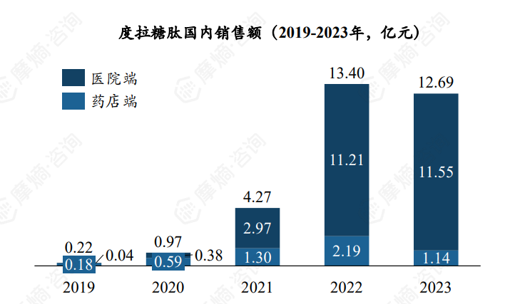 根据摩熵医药数据库,我国度拉糖肽2019-2022年销售额呈现指数增长趋势,2022年达到峰值13.40亿元,2023年销售额稍有下跌,但还是维持在10亿元以上(12.69亿元)。