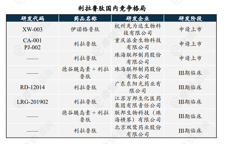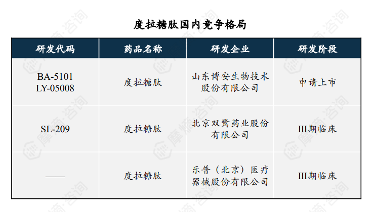 竞争格局方面,目前国内有三家企业在研发阶段,其中山东博安生物技术股份有限公司研发的度拉糖肽已经申请上市,另外两家企业还处于3期临床阶段。