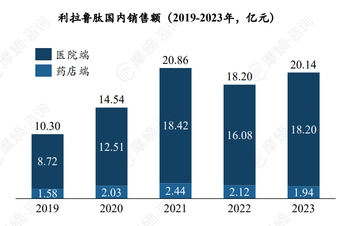 国内市场方面,根据摩熵医药数据库,近五年利拉鲁肽全国销售额整体呈现上升趋势,从2019年10.30亿元增长至2023年20.14亿元,2021年、2023年销售额两度突破20亿元,是国内GLP-1药物第二大品种。