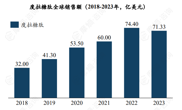 度拉糖肽原研企业为礼来,这款产品上市后在全球市场取得优异的销售表现,从2018年的32.00亿美元攀升至2022年峰值74.40亿美元,2023年下滑至71.33亿美元,整体表现出强劲的增长趋势。