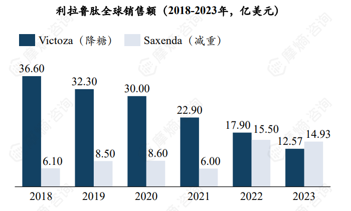8. 利拉鲁肽:初代GLP-RA产品,每日给药一次,全球销售额略有下降