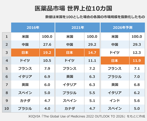 2021年4月日本在每两年一次的药价调整之外又首次实施了“非年度”降价,随着修订的开始,日本药品市场停滞状态更加明显。美国IQVIA去年12月公布的最新全球市场预测显示,2021年日本医药市场达到854亿美元,然而从2016年到2021年,日本医药市场年均增长率每年下降0.5%,预计今后5年也将以年均- 2% ~+1%的低增长率发展,预计到2026年市场规模将被德国超越,退居世界第4位。中国和美国分列第二位和第一位。