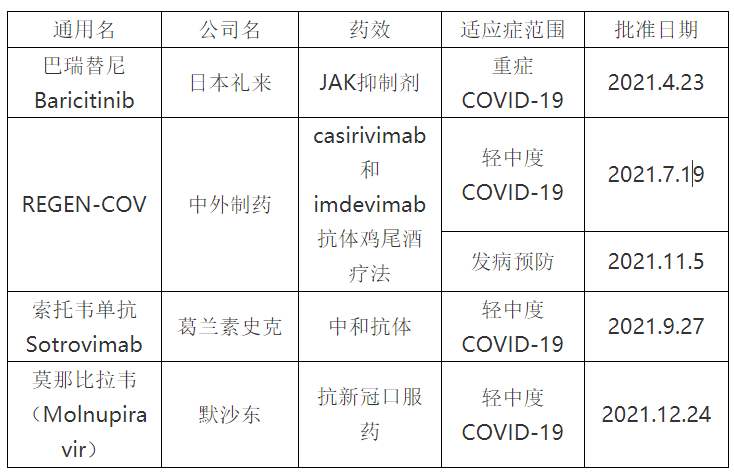 表2 2021年日本批准的新冠治疗药物