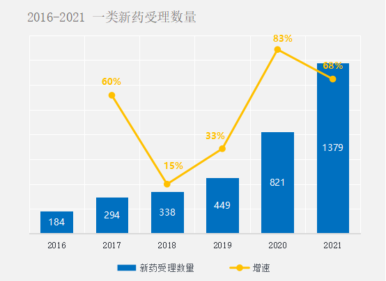 根据药融云《中国 I 类新药靶点白皮书》回顾2016-2021年,短短6年,我国便已上市66款国产1类新药上市(化药和生物类似药),国内Ⅰ类新药受理数量逐年提高;其中,2020 年申请受理数量相较以往增幅最大(增长 83%),反映出 CDE 效率和市场活跃度的大幅提升;2021 年Ⅰ类新药申请受理数量保持增长,申请受理数量同比 2020 年增长 68%,合计达到 1379 件。