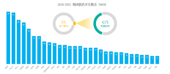 从中国1类新药靶点白皮书中得知,2016-2021期间国内新药涉及靶点top30,仅6%的靶点受理新药数量为41%。其中热门靶点扎堆,赛道拥挤,同质化问题越来越严重,在2022年甚至未来急需发现“中国新”靶点。