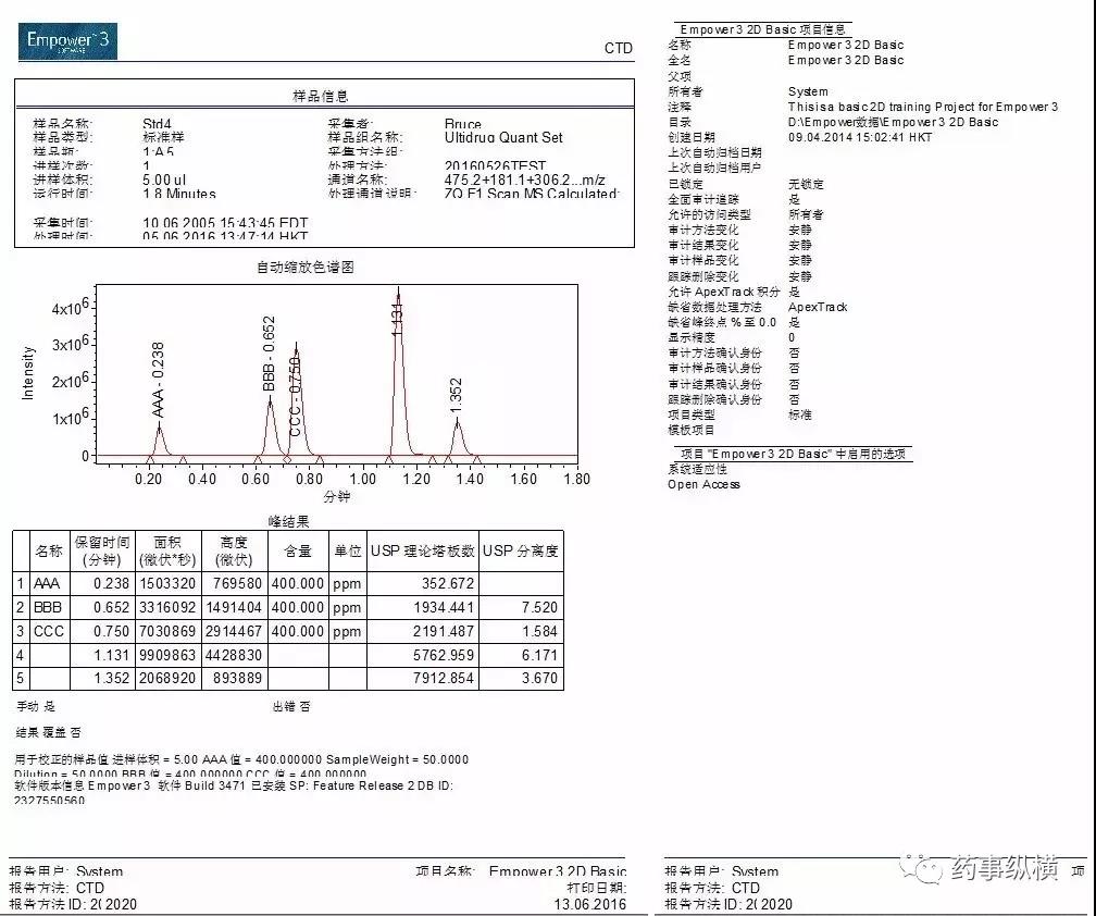 目前大家普遍用网络版的工作站采集数据,下面均以waters的Empower工作站(中文版)中单个结果向导报告模板为例。注:有使用英文版工作站的请自行对应。