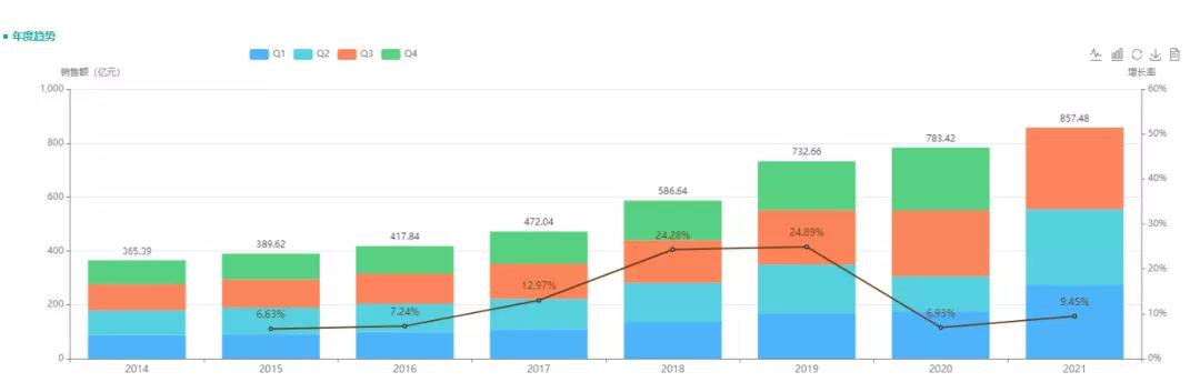 2014-2021抗肿瘤药物市场年度销售额