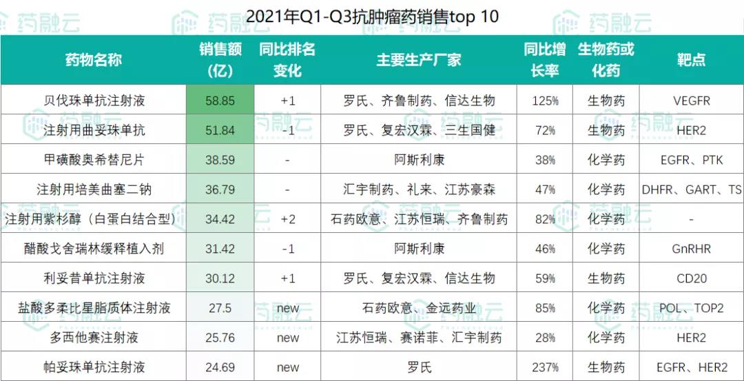 2021年抗肿瘤药物市场前三季度药品销售TOP 10
