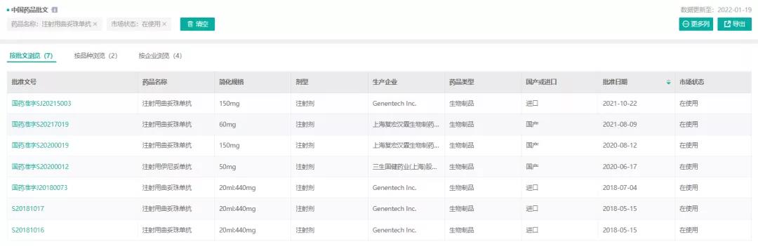 注射用曲妥珠单抗-药品批文信息