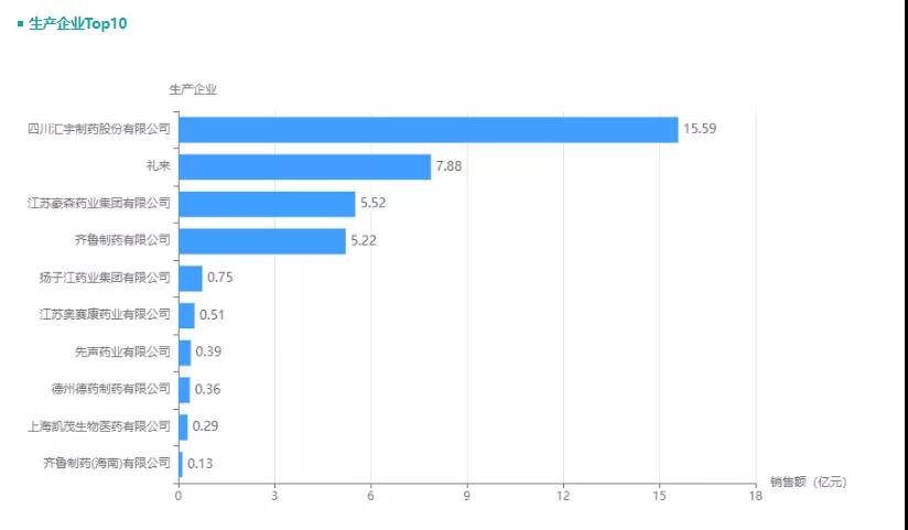 培美曲塞二钠销售额达36.79亿,同比增长4.19%。该药销售市场被仿制药企业挤占,占比高达78.49%。但受带量采购影响,仅原研药及通过仿制药一致性评价的产品能进入集采环节,因此四川汇宇制药和礼来比其他企业更有竞争力,占比分别为42.55%和21.51%。