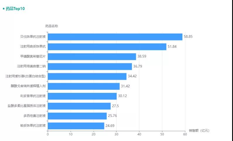 药品销量TOP10中,贝伐珠单抗注射液位居榜首,销量高达58.85亿元,占比16.35%。该产品目前在国内已经获批包含大肠癌、子宫内膜癌、输卵管癌等多个适应症,是抗肿瘤血管生成的代表药物。