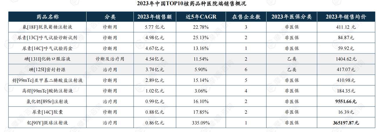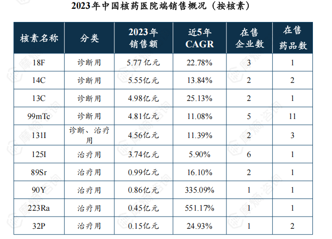 截至2024年10月,中国医院端在售的的核药仅涵盖10种核素,按销售额排名,TOP3核素为18F(5.77亿元)、14C(5.55亿元)、13C(4.98亿元),皆为诊断用核药。从市场增速看,10种核素近5年复合增长率均为正增长,增速TOP3核素为223Ra、90Y、13C,近5年复合增速率分别为551.17%、335.09%、25.13%。