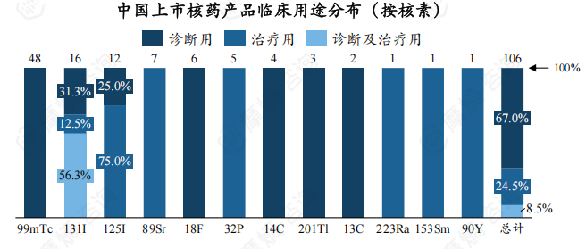 从临床用途看,18F、99mTc、68Ga、13C药物仅用于临床诊断,177Lu、223Ra、125I、89Sr、90Y药物仅用于临床治疗,131I药物既可用于临床诊断又可用于临床治疗。