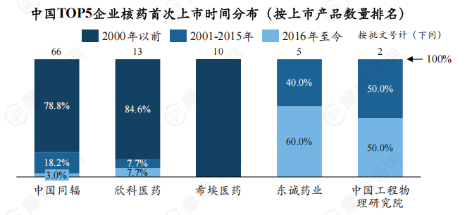 按照上市核药产品数量排名,中国同辐排名第一,有66个商业化产品,占比为62.26%,远高于其他企业;但78.8%产品为2000年以前上市的,2016年至今只有2个核药产品获批。