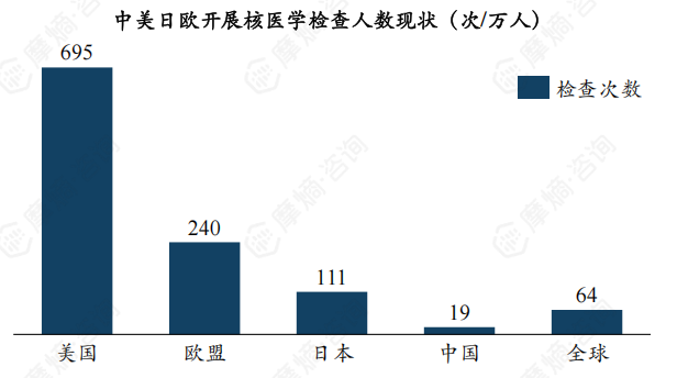 根据近年来核医学普查结果,全球平均每万人开展核医学检查的人数约64人,其中美国695人,欧盟国家240人,日本111人,我国为19人,仅为全球平均水平的30%左右,更远低于世界发达国家水平。