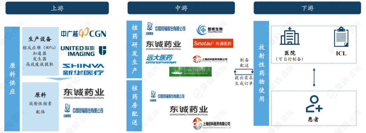 核药产业呈现上游原料紧缺、中游入局者逐渐增多、下游医疗资源供给不足的特征。上游企业中,中广核、联影、新华医疗主要负责生产核反应堆、加速器、发生器等,负责放射性核素、配体等原料生产的企业有东诚药业、中国同辐股份有限公司。中游企业中,从事核药研发生产的企业有东诚药业、远大医药等,从事核药房配送的有东诚药业、中国同辐及上海欣科医药。下游则主要是涉及到医院和患者对放射性药物的使用。