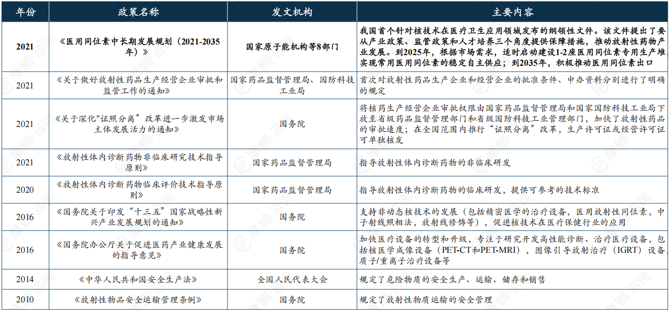 2021年,《医用同位素中长期发展规划(2021-2035年)》发布,这是我国首个针对核技术在医疗卫生应用领域发布的纲领性文件,指出到2025年,一批医用同位素发展的关键核心技术取得突破,适时启动建设1-2座医用同位素专用生产堆,实现常用医用同位素的稳定自主供应;到2035年,积极推动医用同位素“走出去”。