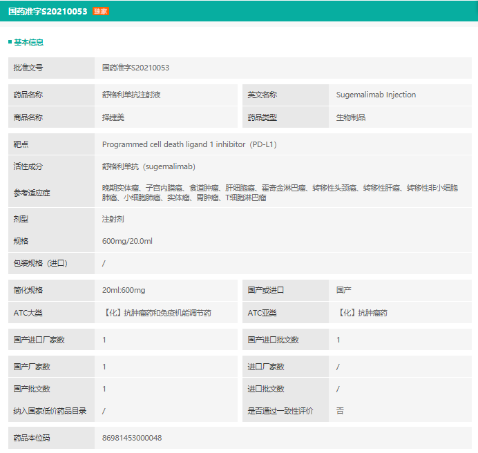 面对如此巨大的未满足的医疗需求,晚期肺癌一线治疗的目标就是最大限度地提高患者的长期生存获益,延缓疾病进展。我们看到,基石药业的舒格利单抗(择捷美®)已于2021.12.21在中国获批上市(国药准字S20210053)。用于联合培美曲塞和卡铂用于表皮生长因子受体(EGFR)基因突变阴性和间变性淋巴瘤激酶(ALK)阴性的转移性非鳞状NSCLC的一线治疗,以及联合紫杉醇和卡铂用于转移性鳞状NSCLC患者的一线治疗。同时,舒格利单抗作为基石药业2021年在中国获批上市的第三款新药,也是全球首个联合化疗获批一线治疗转移性鳞状和非鳞状NSCLC患者的PD-L1抗体。《基石药业舒格利单抗获批上市!国产第2款PD-L1单抗!》