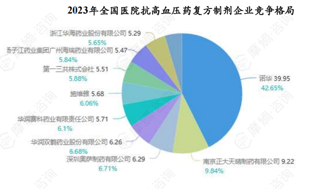 2023年企业竞争格局方面,诺华旗下抗高血压复方制剂产品合计销售额约39.95亿元,市场份额约42.65%,在我国市场上具备绝对优势。其次为正大天晴,2023年市场份额约9.84%。销售额排名前十的企业外资有4家,内资有6家。