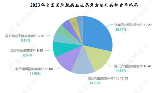 品种竞争格局方面,2023年最畅销产品为沙库巴曲缬沙坦钠片,医院端销售额达32.27亿元,份额占28.57%。其次为厄贝沙坦氢氯噻嗪片,销售额约16.41亿元,份额约14.53%。排名前十的品种年销售额均超过4亿元。