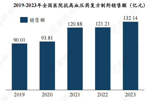 近五年抗高血压复方制剂市场规模稳步增长,据摩熵医药数据库的销售数据统计,医院端销售额从2019年90.01亿元增长至2023年132.14亿元,与钙通道阻滞剂、ACEI降压药、ARB降压药等品类市场规模下滑形成明显对比,预计未来复方制剂市场规模将进一步扩大。