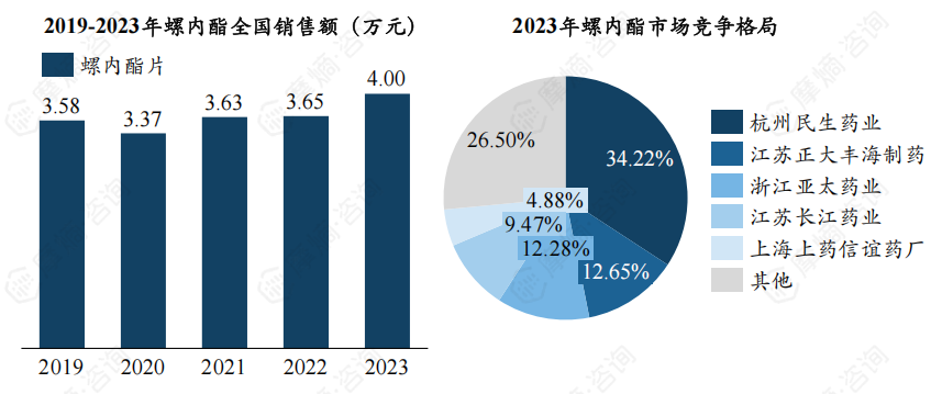 螺内酯为保钾利尿剂代表药物,原研企业为辉瑞,最早于1959年在加拿大上市,商品名为Aldactone。根据摩熵医药数据库,我国螺内酯片2023年销售额达4亿元,杭州民生药业占据三成市场。