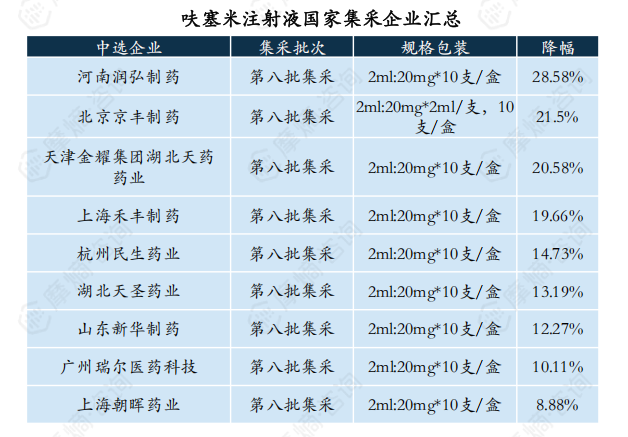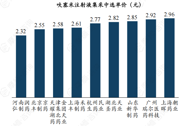 据摩熵医药集中采购数据统计,呋塞米注射液于2023年入选第八批国家集采,中选企业有河南润弘制药、北京京丰制药、上海禾丰制药等9家企业,价格平均降幅约18%。河南润弘制药降幅最高,约28.58%,中选单价为2.32元;上海朝晖药业降幅最低,约8.88%,中选单价为2.96元。