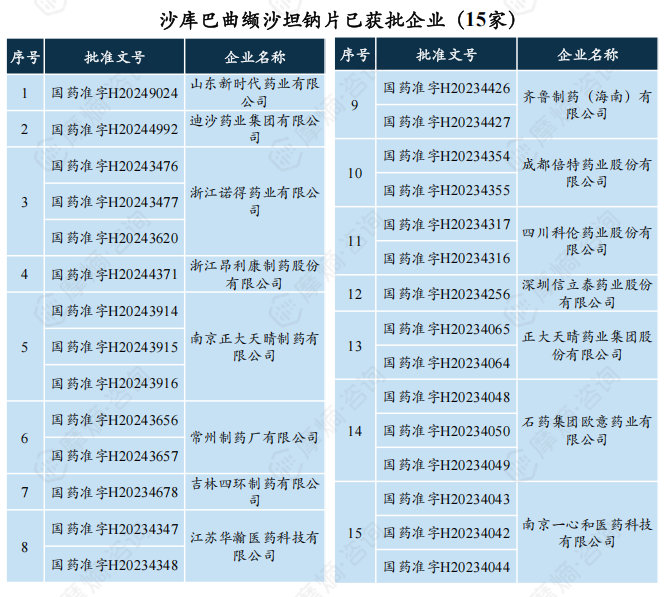 该产品吸引多家本土药企争相布局,2023年8月至2024年,国内相继有15家企业获得仿制药生产批文,目前暂未实现商业化,诺欣妥专利到期日为2026年11月,预计未来沙库巴曲缬沙坦钠片市场竞争将逐渐加剧。