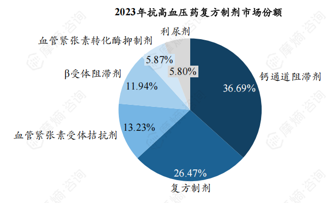 五大类一线降压药份额分别为钙通道阻滞剂36.69%、ARB降压药13.23%、β受体阻滞剂11.94%、ACEI降压药5.87%、利尿剂5.80%。复方制剂目前已成为抗高血压药物第二大品类,2023年占比约26.47%。