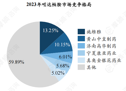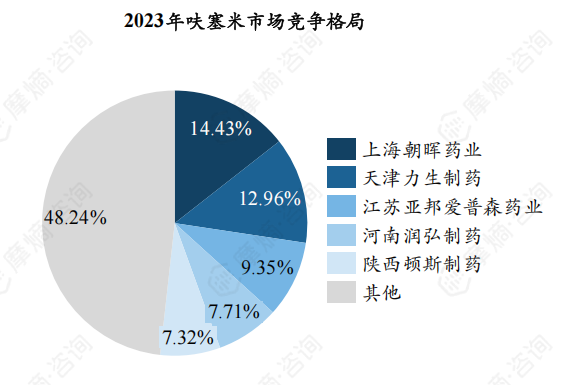 上海朝晖药业为市场份额最大的企业,2023年份额约14.43%,天津力生制药、江苏亚邦爱普森药业紧随其后。