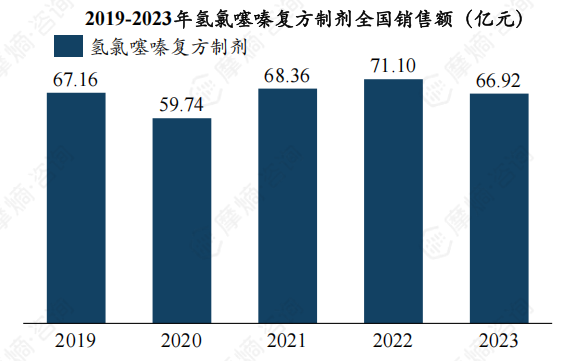 氢氯噻嗪复方制剂为目前我国临床上最主要应用的噻嗪类利尿剂,根据摩熵医药数据库,2019-2023年氢氯噻嗪复方制剂销售额整体维持在60-70亿元,2022年高达71.10亿元。复方制剂销售额远超单方制剂,其中销售额最大的复方制剂产品为厄贝沙坦氢氯噻嗪片,2023年全国销售额约23.67亿元。