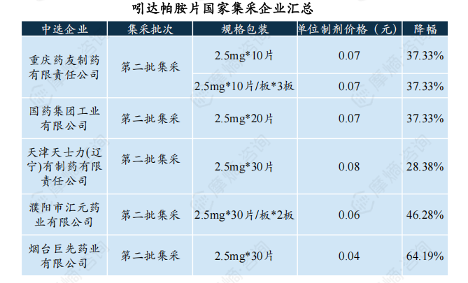 吲达帕胺片第二批集采中选企业包括重庆药友制药、国药集团、天津天士力制药等5家企业,其中烟台巨先药业降幅最高,约64.19%,中选单位制剂价格低至0.04元/片。