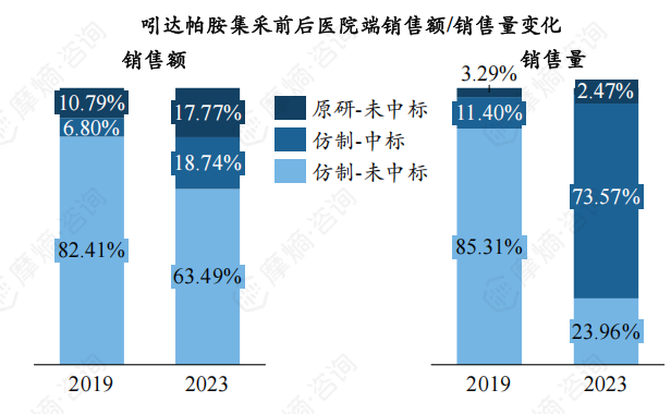 原研企业施维雅未中标,集采后院内销量小幅下滑。五家中标企业集采后院内销量从11.4%提升至73.57%,增幅超60%,销售额提升至18.74%。目前吲达帕胺院内市场主要被未中标仿制药企占据,2023年销售额占比约63.49%。