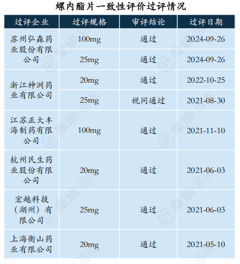 据摩熵医药一致性评价数据统计,螺内酯片一致性评价过评企业数量共6家,上海衡山药业为首家过评企业,过评规格为20mg,过评日期为2021年5月10日。