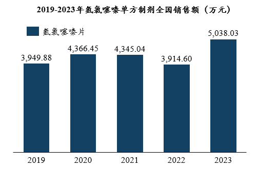 氢氯噻嗪是一种广泛使用的中效利尿剂,原研企业为默克,最早于1959年2月在美国上市,商品名为“ESIDRIX”。国内上市的氢氯噻嗪产品主要包括单方制剂和复方制剂。根据摩熵医药销售数据库统计,我国氢氯噻嗪单方制剂销售额整体较小,近五年呈现波动增长趋势,2023年销售额达5038.03万元。