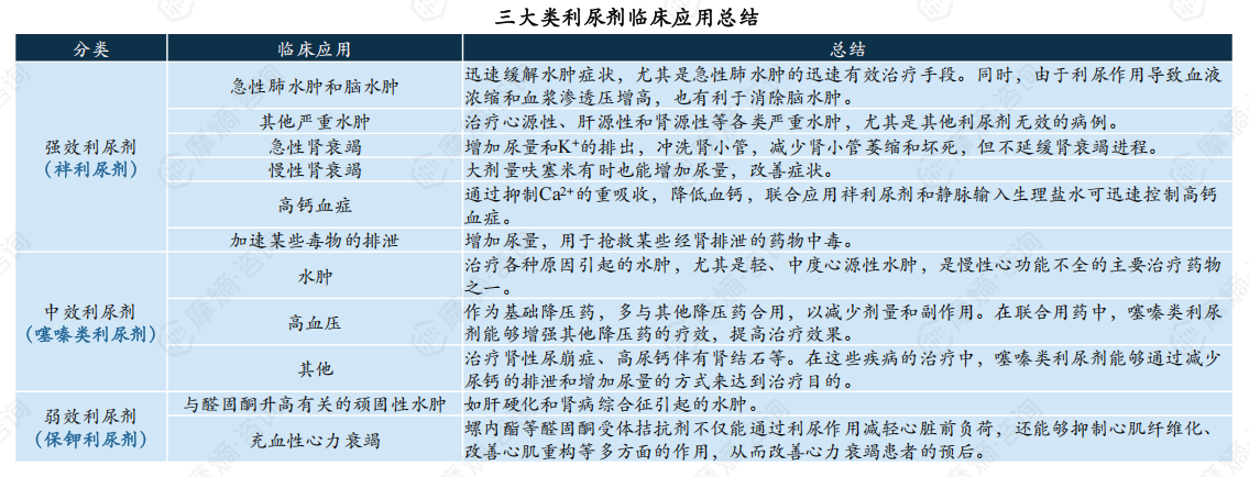 袢利尿剂在临床上主要用于急性肺水肿和脑水肿、其他严重水肿、急性肾衰竭、慢性肾衰竭、高钙血症以及加速某些毒物的排泄等六大方面;保钾利尿剂主要用于与醛固酮升高有关的顽固性水肿、充血性心力衰竭。噻嗪类利尿剂主要用于水肿及高血压,作为基础降压药,多与其他降压药合用,以减少剂量和副作用。在联合用药中,噻嗪类利尿剂能够增强其他降压药的疗效,提高治疗效果,这一类利尿剂目前在临床上应用最广泛。