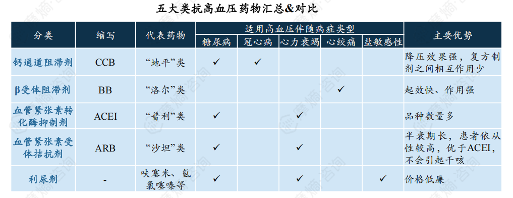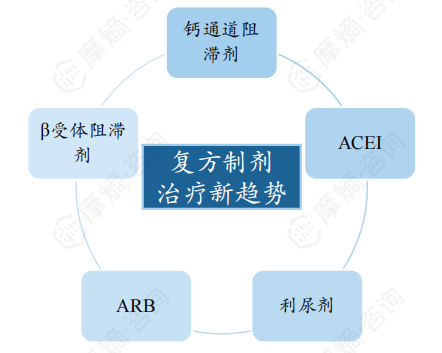 目前我国高血压仍以单药治疗为主,由五大类单药组成的复方制剂也逐渐被广泛应用,未来有望成为高血压市场的主导品类。