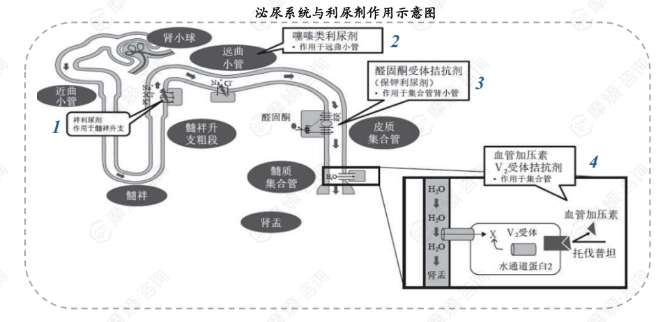 利尿剂是一类作用于肾脏进而促进体内Na+、Cl-等电解质和水的排泄、增加尿量、消除水肿的药物,是五类常用抗高血压药之一(五类常用抗高血压药物包括钙通道阻滞剂(CCB)、β受体阻滞剂(BB)、血管紧张素转化酶抑制剂(ACEI)、血管紧张素受体拮抗剂(ARB)及利尿剂)。常用的利尿药按照作用部位的不同分为四类,包括(1)作用于髓袢升支的袢利尿剂;(2)作用于远曲小管的噻嗪类利尿剂;(3)作用于集合管肾小管的醛固酮受体拮抗剂;(4)作用于集合管的血管加压素V2受体拮抗剂。