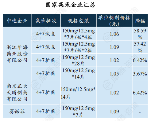 集采中选企业包括浙江华海药业、南京正大天晴以及原研企业赛诺菲三家,价格最高降幅达58.59%,最低中选单价为1.02元/片。