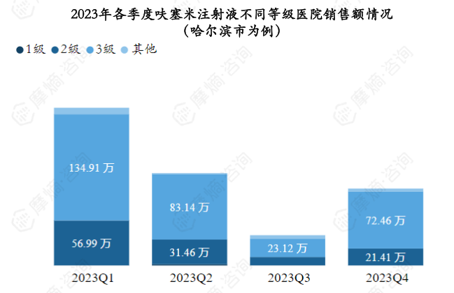 同样以哈尔滨市为例,呋塞米注射液2023年销售市场主要以二、三级医院为主,其中三级医院占大部分市场份额,各季度三级医院销售额占比均超过60%。